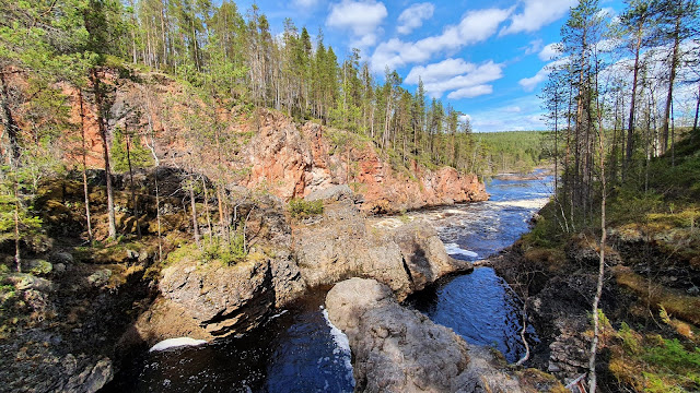 Merenojan nuotiopaikalla keittelin meille lounasta auringonpaisteessa. Reitin suurin nähtävyys oli tietysti Kiutaköngäs muutama sata metriä ennen meidän päätepistettä. Tulvahuippu oli jo mennyt viikko aiemmin, mutta veden kohinaa oli silti. Kuului selvästi jo puolentoista kilometrin päähän.